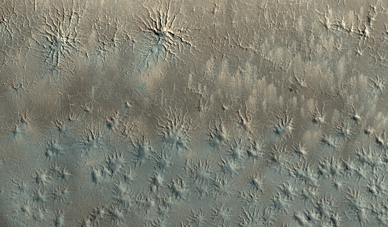 In contrast to Earth, New Year comes to Mars when northern hemisphere is in spring, and it is fall in southern hemisphere. For areas that you are analyzing this means rather boring time: all the ices are gone from the surface and the ground stands bare and inactive. But even inactive, the scenery is still very impressive. For the New Year celebration we decided to share with you a glimpse into a very fresh HiRISE image. It was taken only a week ago. Some of you might recall the area you were studying! Now there are only dim reminders of the fans that you are marking for us so efficiently.